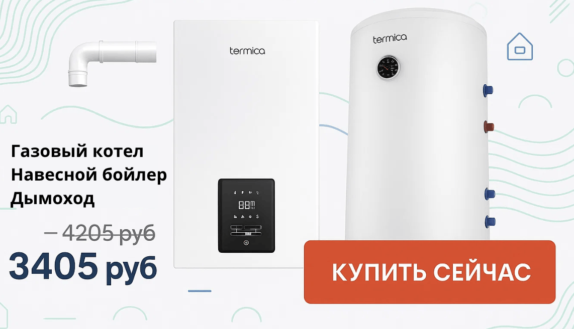 Комплект отопления дома от бренда Termica: одноконтурный газовый котёл VITA 24 кВт + навесной бойлер косвенного нагрева 150 л + дымоход — купить со скидкой 800 руб.