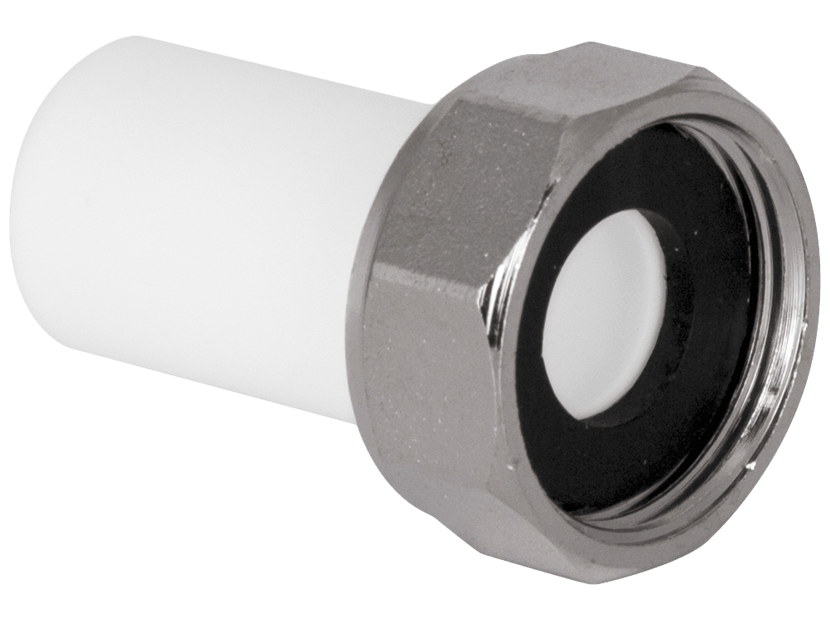 Купить штуцер TEBO с накидной гайкой из полипропилена белого цвета в Минске по лучшей цене первого поставщика у нас - Инжиниринговая компания ТеплоСтройИнвест.