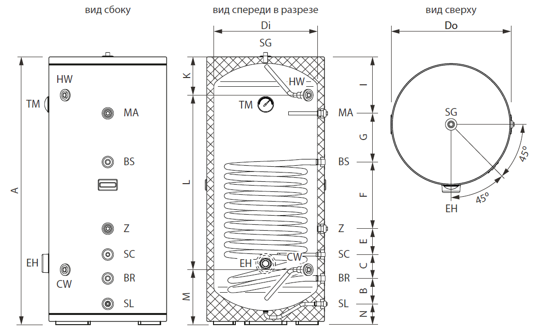 | CW Вход холодной воды (ХВС) | 3/4" НР |