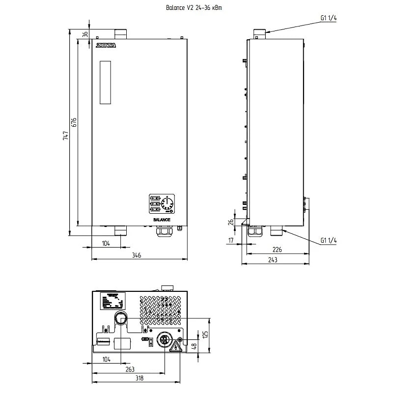 Габаритные размеры электрического котла отопления Зота Баланс 30 кВт: