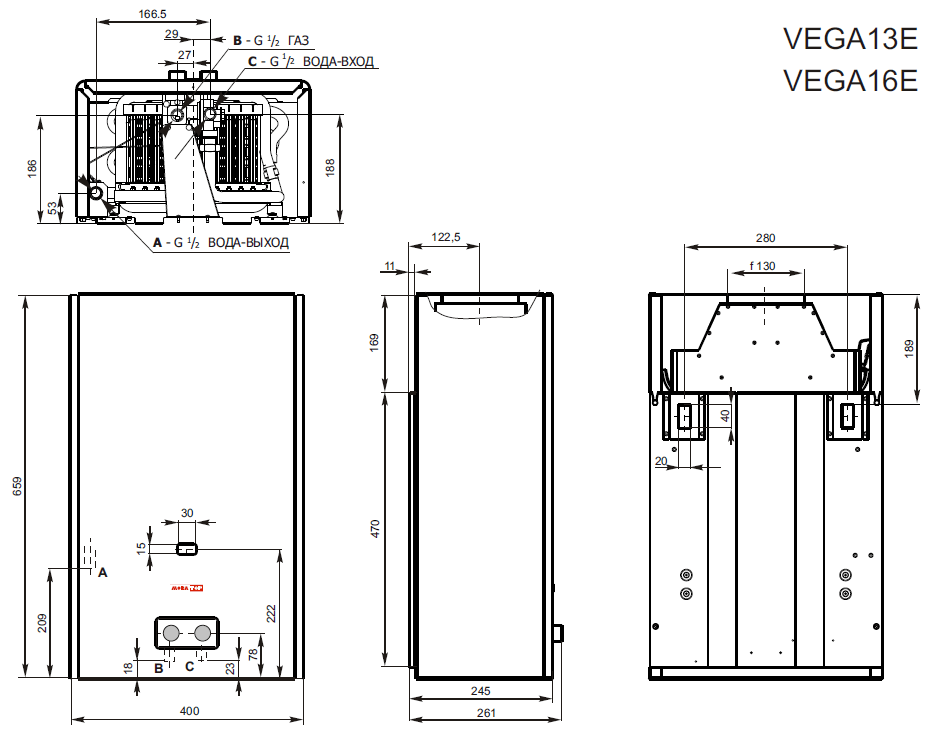 Габаритные размеры газовой колонки Мора Топ Вега 16Е: