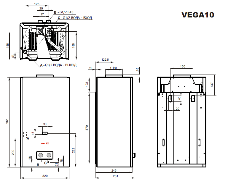 Габаритные размеры газовой колонки Мора Топ Вега 10: