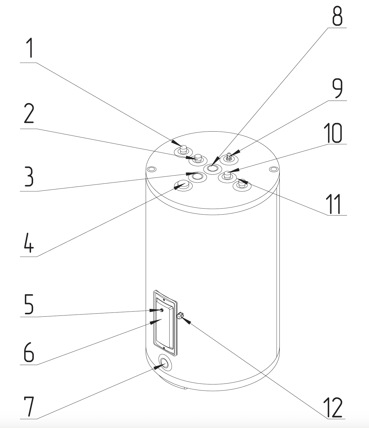 ![]() | 1 - Выход горячей воды G3/4’’ НР 2 - Подача от котла G3/4’’ НР 3 - Рециркуляция G1/2’’ ВР 4 - Магниевый анод 5 - Сигнальная лампочка 6 - Короб установки ТЭН 7 - Дренаж G3/4’’ BP 8 - T/P клапан G3/4’’ BP 9 - Гильза датчика 10 - Возврат в котел G3/4’’ НР 11 - Вход холодной воды G3/4’’ НР 12 - Сальник для подключения провода питания PG 11 |