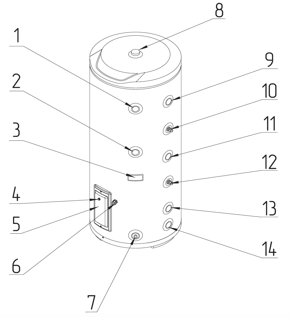 ![]() | 1- T/P клапан G3/4’’ BP 2 - Рециркуляция G1/2’’ BP 3 - Ручка 4 - Сигнальная лампочка 5 - Короб установки ТЭН 6 - Сальник для подключения провода питания PG 11 7 - Дренаж G3/4’’ BP 8 - Магниевый анод 9 - Выход горячей воды G3/4’’ BP 10 - Гильза датчика 11 - Подача от котла G3/4’’ BP 12 - Гильза датчика 13 - Возврат в котел G3/4’’ BP 14 - Вход холодной воды G3/4’’ BP |