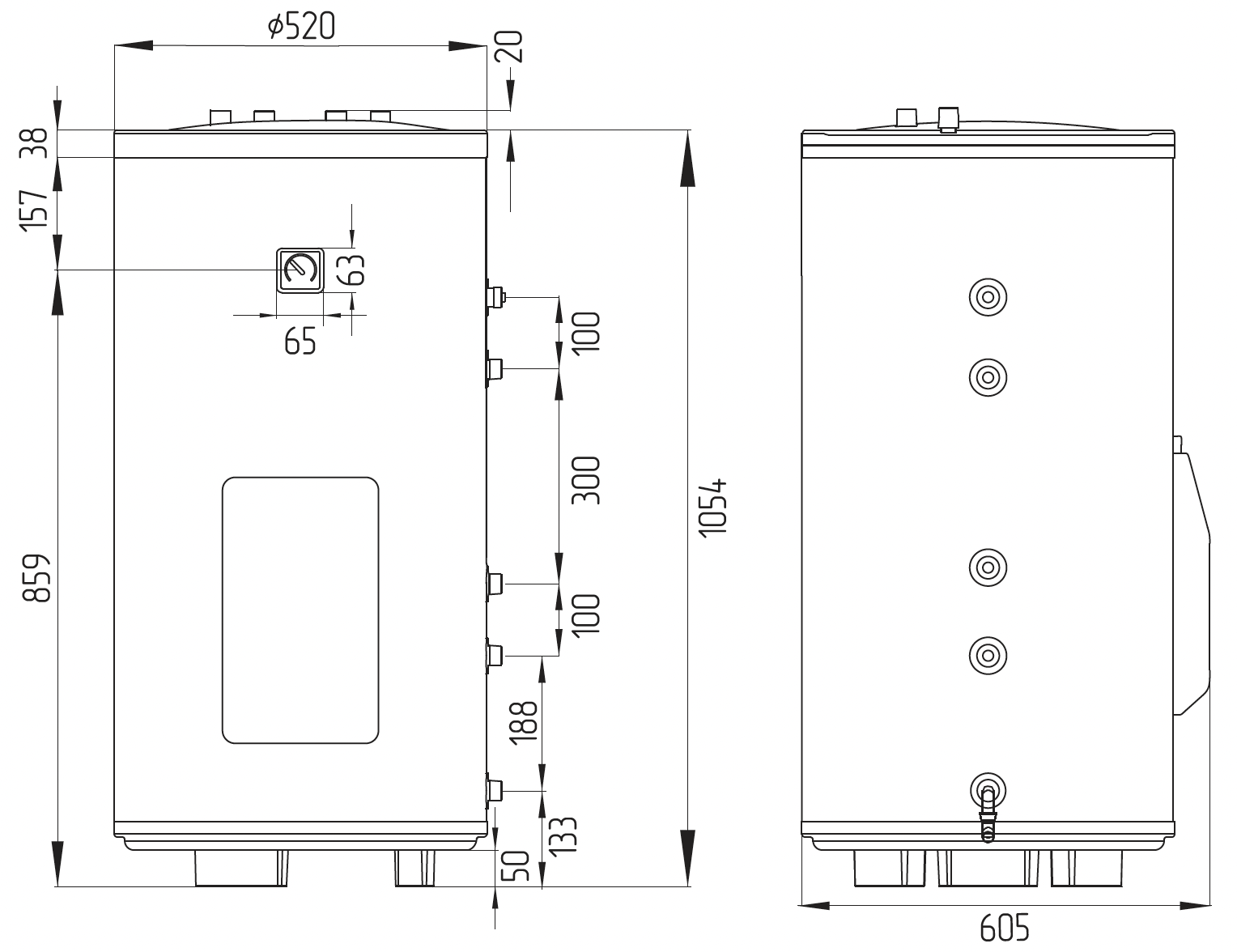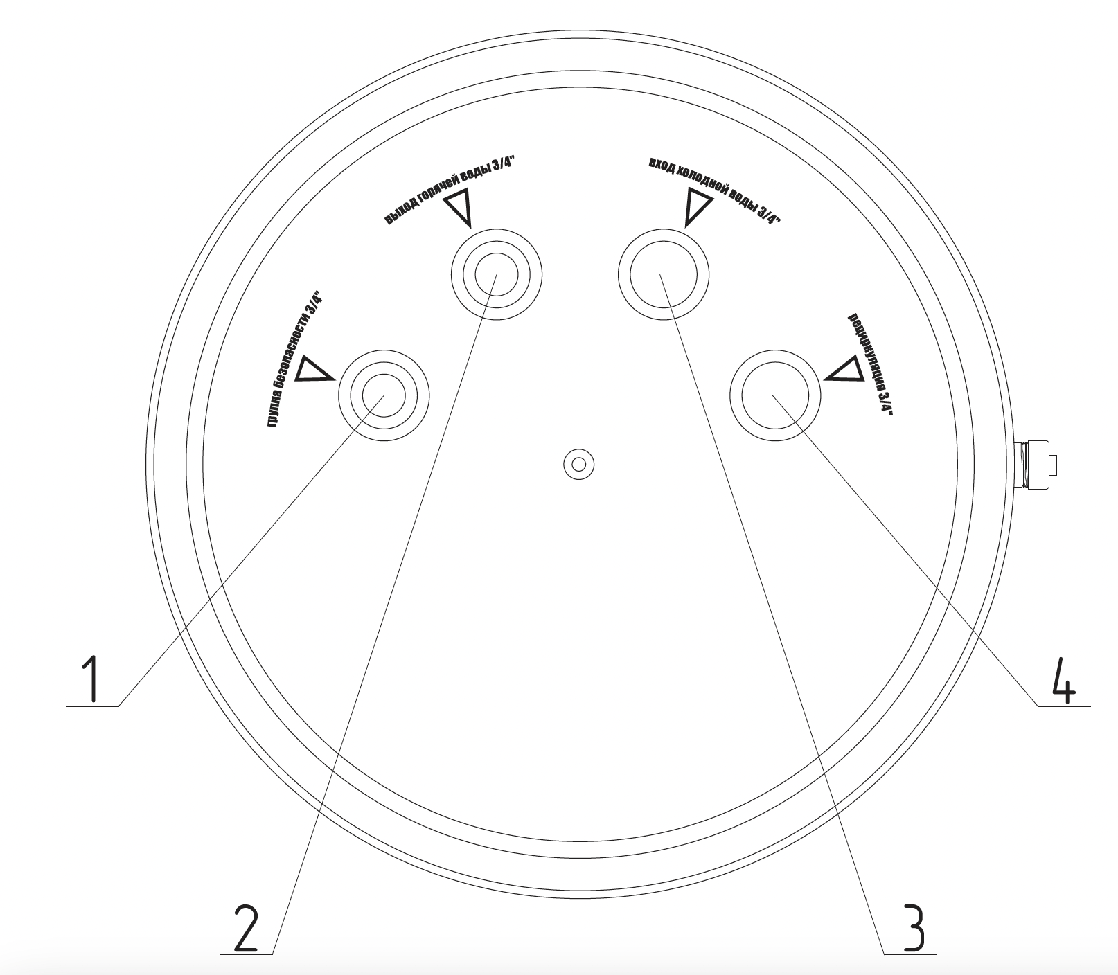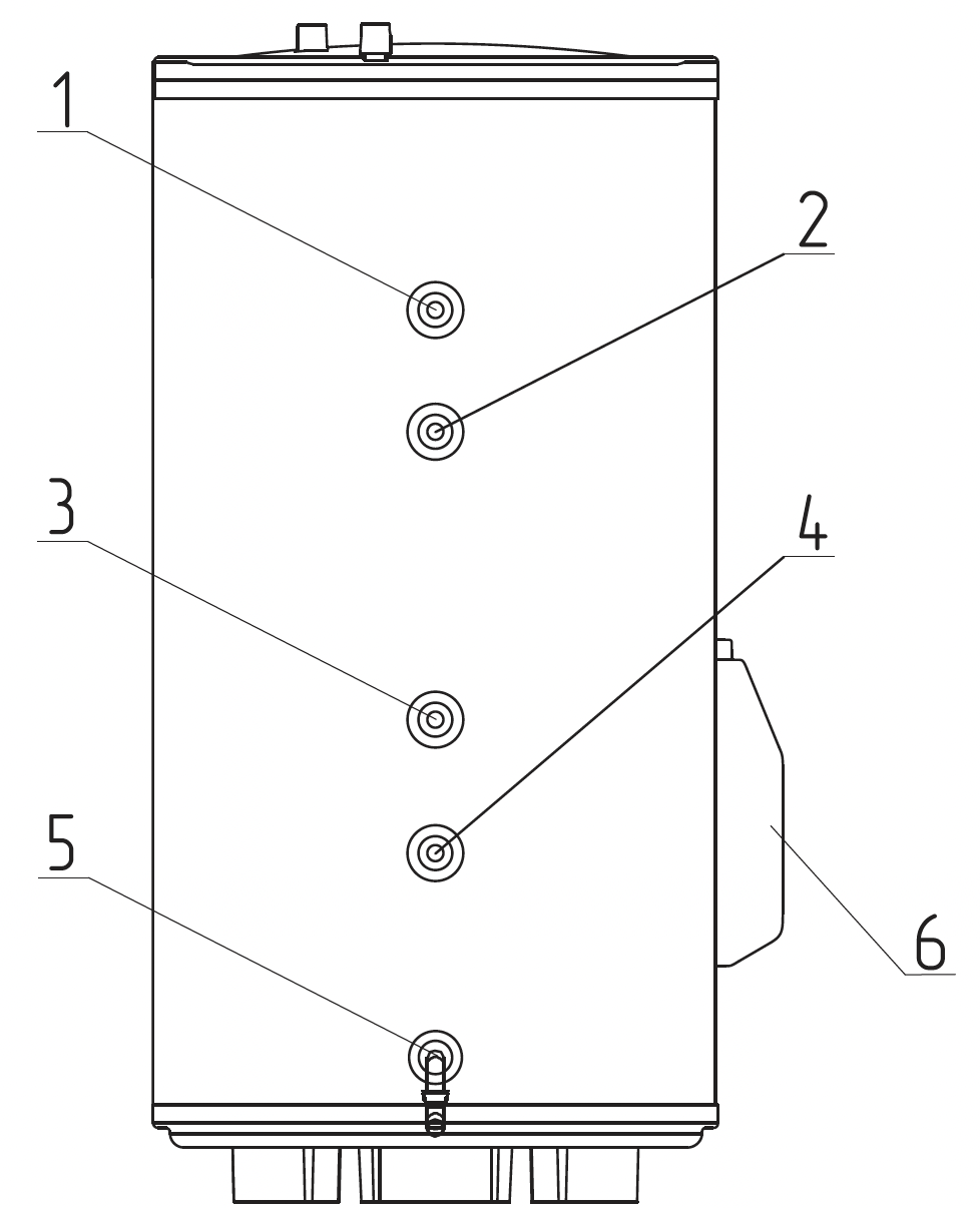 | 1 - Магниевый анод 3/4’’ 2 - Подача от котла 3/4’’ НР 3 - Гильза датчика 1/2‘‘ 4 - Возврат в котел 3/4’’ НР 5 - Дренаж 1/2’’ ВР 6 - ТЭН | 1 - Группа безопасности 3/4’’ НР 2 - Выход горячей воды 3/4’’ НР 3 - Вход холодной воды 3/4’’ НР 4 - Рециркуляция 3/4’’ НР | 1 - Индикатор нагрева 2 - Индикатор питания сети 3 - Клавиши управления (выбор мощности ТЭНа) 4 - Ручка регулировки температуры термостата 5 - Кнопка сброса термостата перегрева |