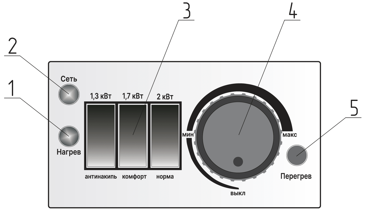 Комбинацией включения нагревательных элементов 1,3 кВт, 1,7 кВт и 2 кВт можно установить семь различных ступеней мощности нагрева: 1,3 — 1,7 — 2 — 3 — 3,3 — 3,7 — 5 кВт.