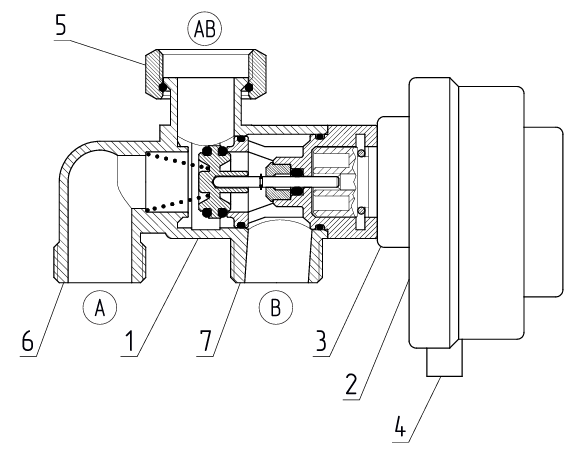 | 1 - Трехходовой клапан 2 - Электрический линейный привод 3 - Фланец двигателя 4 - Трёхконтактная вилка 5 - Вход в трехходовой клапан (АВ) | 6 - Выход в систему отопления (А) 7 - Выход в контур змеевика косвенного водонагревателя (В) |