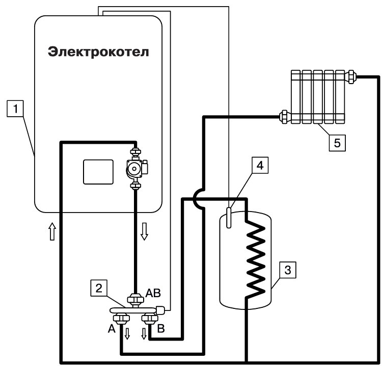 ![]() | 1 - Котёл 2 - Трехходовой клапан 3 - Бак водонагревателя ГВС 4 - Датчик температуры ГВС 5 - Отопительные приборы |