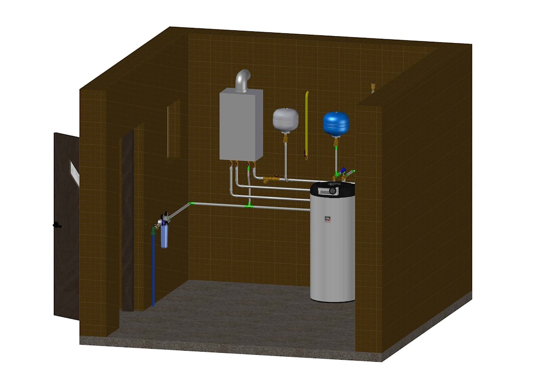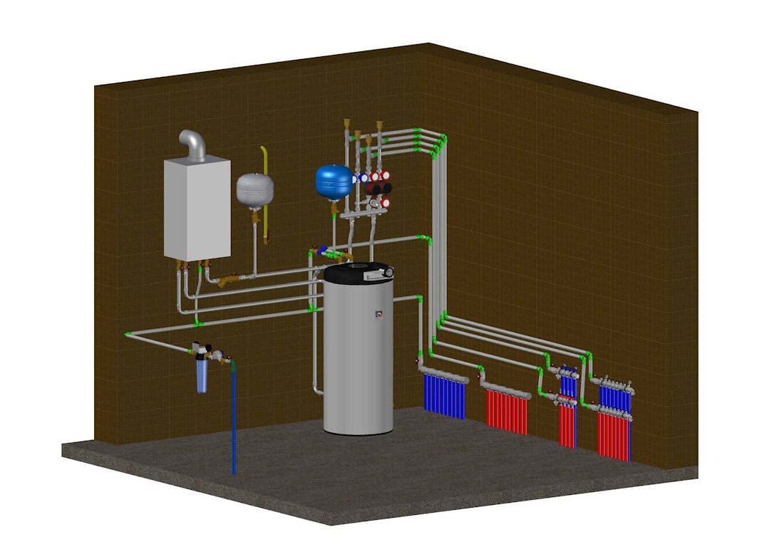 Расстановка оборудования в котельной: размещение котла, водонагревателя, трубопроводов и радиаторов в соответствии с особенностями дома, обеспечивая оптимальное функционирование системы.