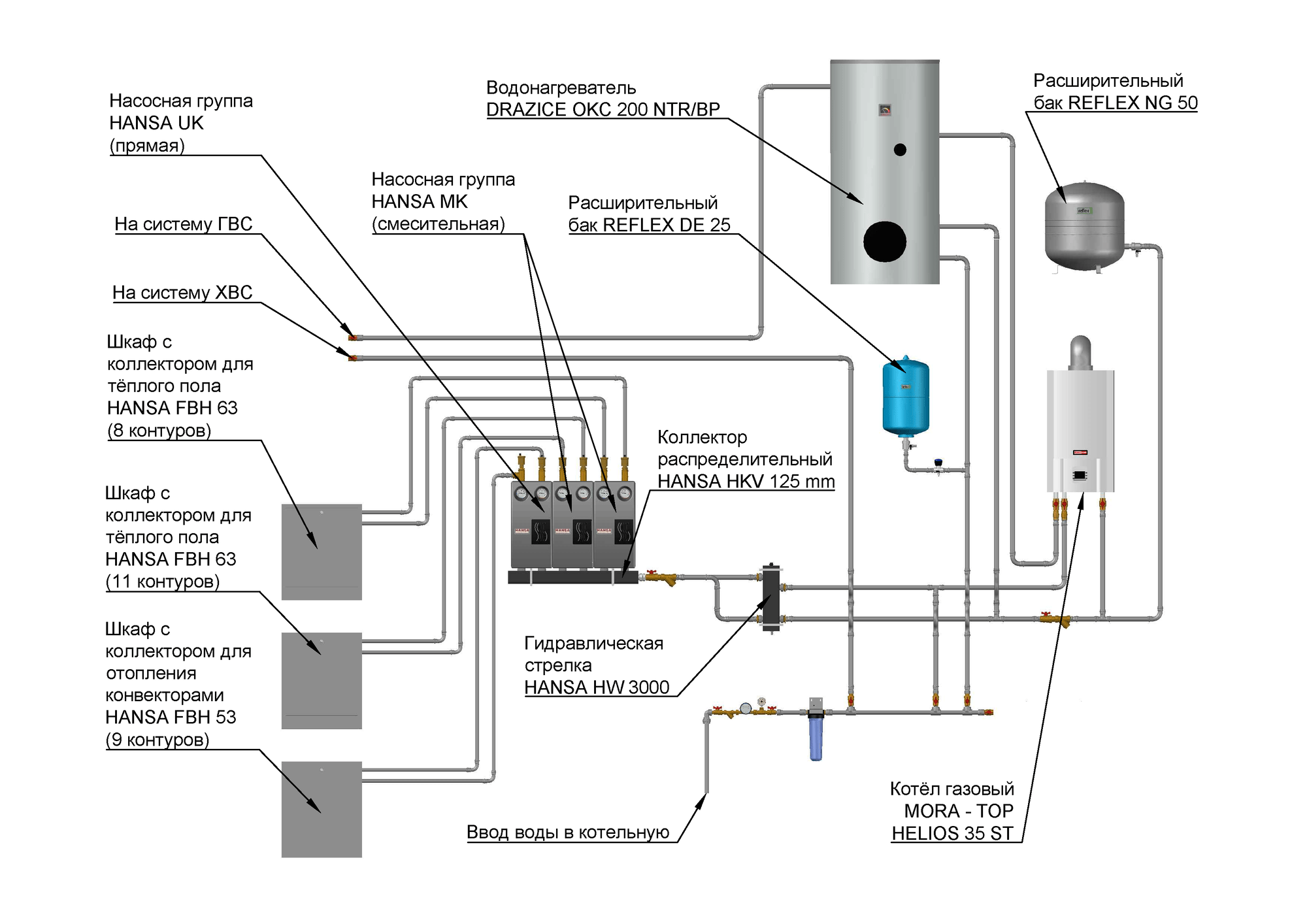 Проект котельной с одноконтурным газовым котлом MORA-TOP Helios 35 для частного дома площадью 250 м2. Для приготовления горячей воды проектом предусмотрен бойлер косвенного нагрева чешского производителя DRAZICE объемом 200 литров с возможностью дополнительной установки сухого керамического ТЭНа. Установлена насосная смесительная и прямая группа HANSA (Германия) из нержавеющей стали, гидравлическая стрелка и распределительный коллектор, гребенки теплого пола и гребенки для отопления конвекторами так же немецкого бренда HANSA.