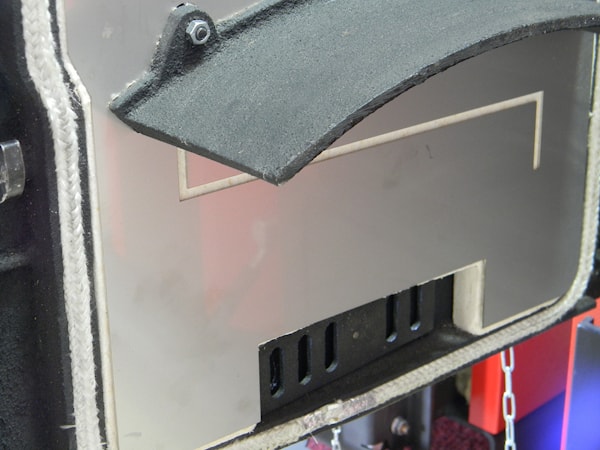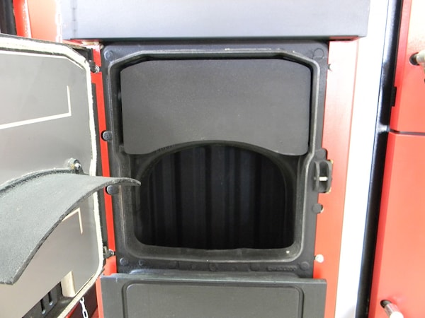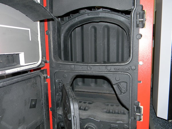 Дверца верхней камеры имеет жаростойкую теплоизоляционную плиту, дополнительно покрытую защитной панелью из нержавеющей стали, на которой имеются специальные вырезы для компенсации температурных расширений. Защитная панель предохраняет теплоизоляционную плиту от механических повреждений, например, от неаккуратно загруженных дров. Для направления топочных газов в систему газоходов, на дверце установлен чугунный отсекатель с конусным профилем толщиной до 5 мм.