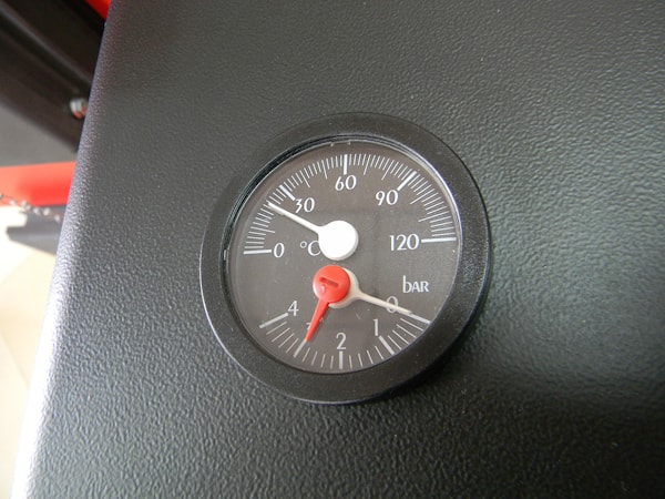 Термоманометр позволяет наблюдать за текущей температурой и давлением котла. Размер стрелок, шкала и шрифт легко читаемы.