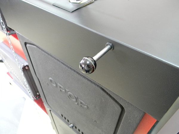 На лицевой части чугунного котла OPOP UNI 3 находится удобный и надежный рычаг регулировки заслонки дымовой трубы (шибера). Заслонкой регулируется тяга дымохода. Шибер в этом твердотопливном котле является встроенным. У многих производителей котлов заслонка по умолчанию отсутствует, ее приходится докупать, что ведет к удорожанию дымохода.