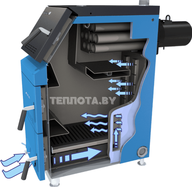 - Теплообменник состоит из трех контуров. Трубчатый теплообменник в комбинации со съемной заслонкой создают трехходовой теплообменник. Конструкция позволяет более эффективно снимать тепло с выходящих дымовых газов, тем самым увеличивает КПД.