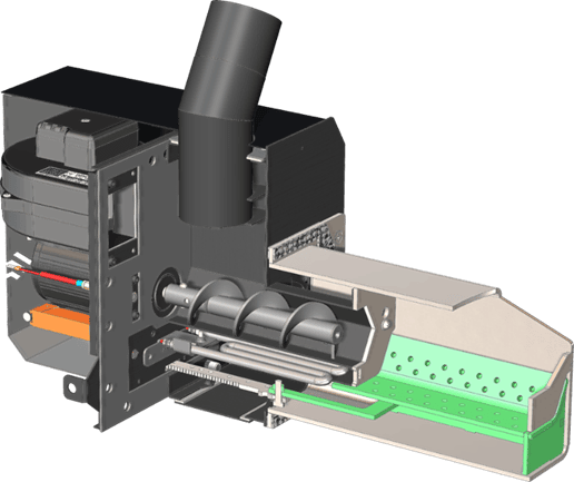 Приставная пеллетная горелка обеспечивает дозированную подачу топлива и воздуха в топочное пространство за счет наличия дополнительного шнека подачи и вентилятора наддува. В конструкции горелки реализована функция автоподжига. Автоматическая очистка горелки производится механизмом автоматического перемещения чаши топки.