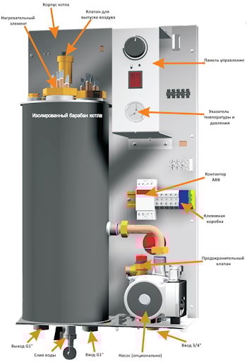 В электрокотле MINI 6 кВт предусмотрена возможность подключения циркуляционного насоса и расширительного бака.