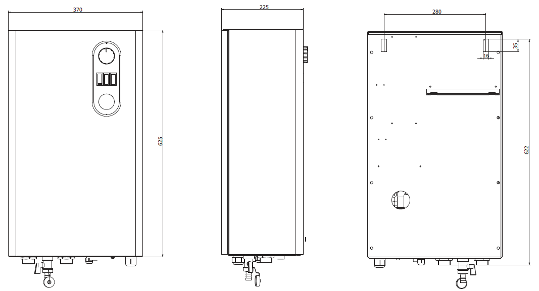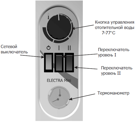Электрокотлом MINI 6 кВт можно управлять с помощью панели управления, на которой можно установить требуемую мощность и температуру отопительной воды. Панель управления также служит для отображения актуальных величин давления и температуры.