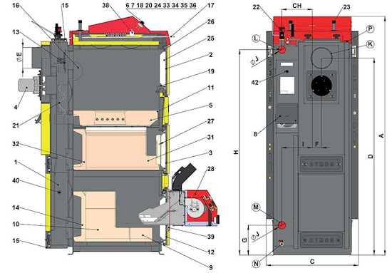 | 15 | Лючок для очистки котла | 40 | Измерение для анализатора продуктов сгорания |