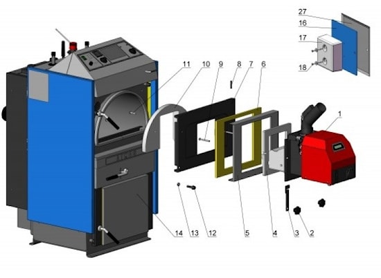 | 1 - пеллетная горелка 2 - пластмассовая ручка 3 - концевой выключатель 4 - уплотнительный шнур 5 - крышка дверцы 6 - изоляция 7 - дверца с отверстием под горелку 8 - крепеж дверцы | 9 - винт крепления сибрала 10 - сибрал 11 - винты для крепления горелки 12 - стопорный винт 13 - гайка 16 - крышка 17 - сибрал 18 - винты крепления 27 - крышка заглушки |
