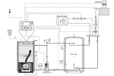 Данные схемы являются примером грамотного монтажа для эффективного и экономичного отопления. По желанию заказчика для обвязки малого контура вместо насосного узла малого контура LADDOMAT можно использовать термостатический вентиль REGULUS, насос и обратный клапан без пружины. В случае необходимости возможно установка пеллетного котла без буферного бака.