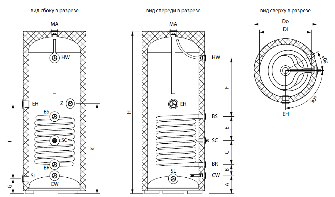 Водонагреватель снабжен отдельными патрубками для рециркуляции, слива воды и установки ТЭНа, в качестве дополнительного источника нагрева.