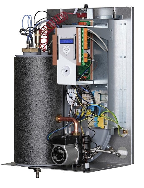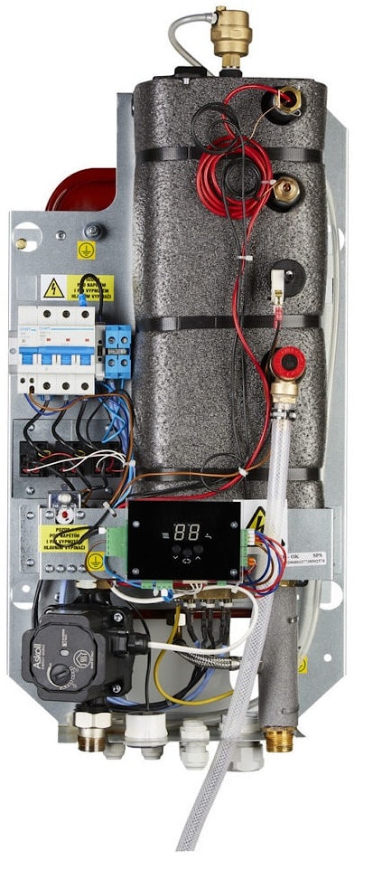 Электрический котел отопления состоит из теплообменника и приборов управления и безопасности. Некоторые электрические котлы сразу комплектуются циркуляционным насосом, расширительным баком, предохранительным клапаном и фильтром.
