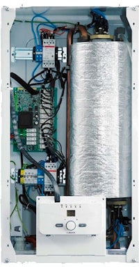 Электрический котел Bosch Tronic Heat 3000 является не самый доступным продуктом от знаменитой немецкой компании. Дизайн радует – компактный, солидный, ультрасовременный. Всего в линейке 7 модификаций от 4 до 24 кВт. Ступеней регулировки мощности – 3. Заявленный КПД – 99.7%. Насоса с расширительным баком нет. По этой причине Tronic Heat 3000, как и большинство котлов подобного формата, актуален в качестве резервного устройства в дополнение к котлам, работающим на газовом, твёрдом и прочих видах топлива. Впрочем, и с ролью основного источника тепла может справиться уверенно. Для обеспечения ГВС монтаж должен производиться в сочетании с баком косвенного нагрева. Основные плюсы: