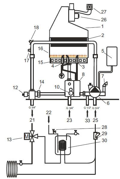 | 1 - коллектор продуктов сгорания 2 - теплообменник 4 - электрод зажигания 5 - расширительный бак 6 - насос с атмосферным клапаном 7 - предохранительный клапан ОВ 3 бар 8 - блок управления 9 - датчик протока 10 - газовая арматура | 11 - датчик температуры ГВС 12 - датчик давления 13 - трехходовой клапан 14 - байпас клапан 15 - горелка 16 - камера сгорания 17 - датчик температуры ОВ 18 - аварийный термостат ОВ 19 - ограничитель продуктов сгорания 20 - вторичный теплообменник 21 - выход ОВ 22 - выход ГВС | 23 - вход газа 24 - вход холодной хозяйственной воды 25 - вход ОВ26 - вентилятор продуктов сгорания 27 - маностат 28 - предохранительный обратный клапан на входе ГВС 29 - фильтр на ОВ 30 - бойлер 31 - ограничитель продуктов сгорания 33 - кран для заполнения ОВ |