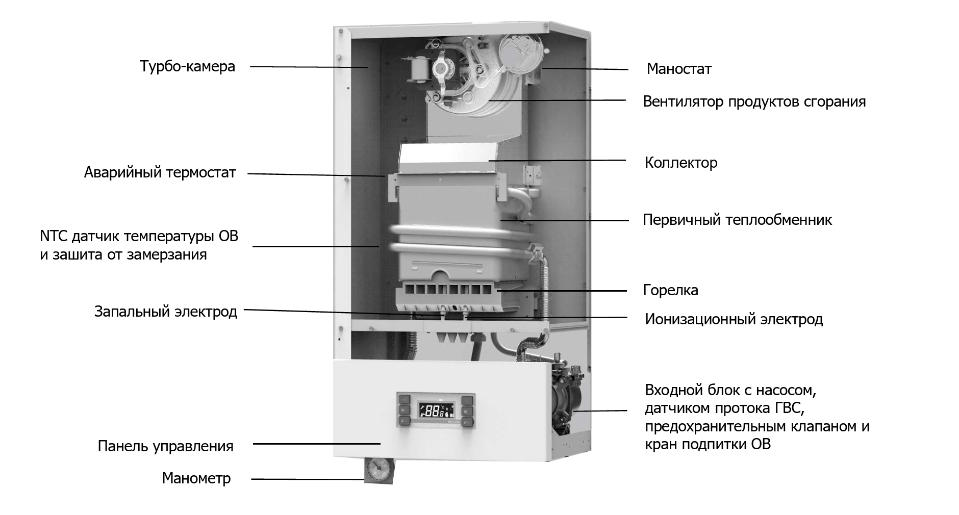 закрытой камерой сгорания с принудительным отводом продуктов сгорания. В случае выключения вентилятора происходит отключение маностата воздуха. В случае, если блок управления даст команду на запуск вентилятора, то произойдет включение маностата воздуха.