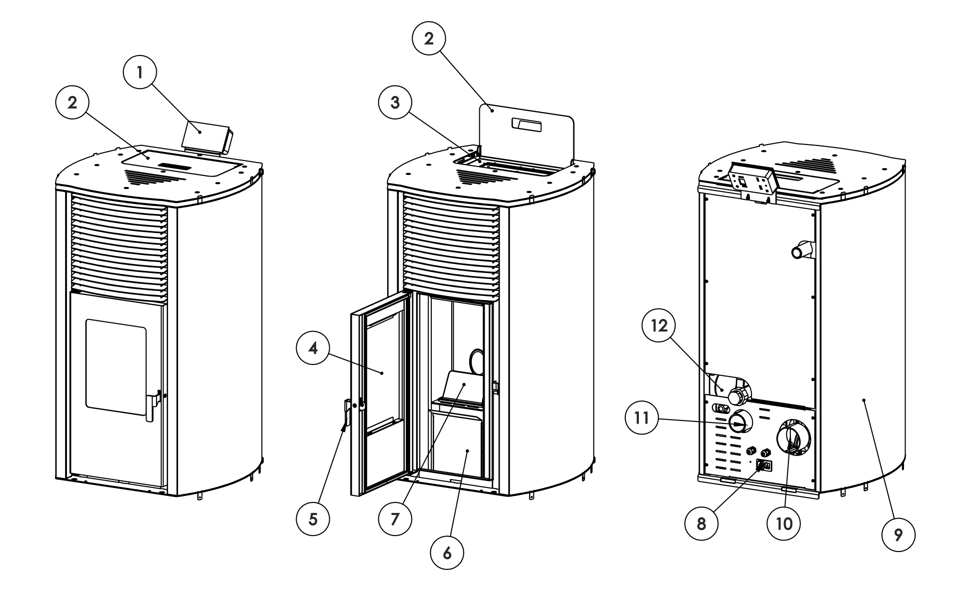| 1. Контроллер 2. Крышка бункера для пеллет 3. Бункер для пеллет 4. Термостойкое стекло 5. Дверь 6. Зольник | 7. Пеллетная горелка 8. Электрическое подключение 9. Декоративные панели 10. Дымоход 11. Трубка для впускного воздуха 12. Трубка подачи холодной воды |