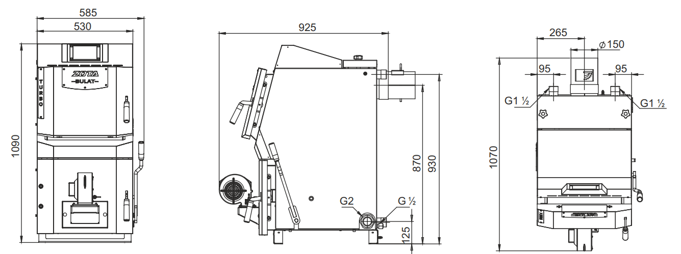 Габаритные размеры и монтажные подключения стального котла отопления ZOTA BULAT TURBO 25: