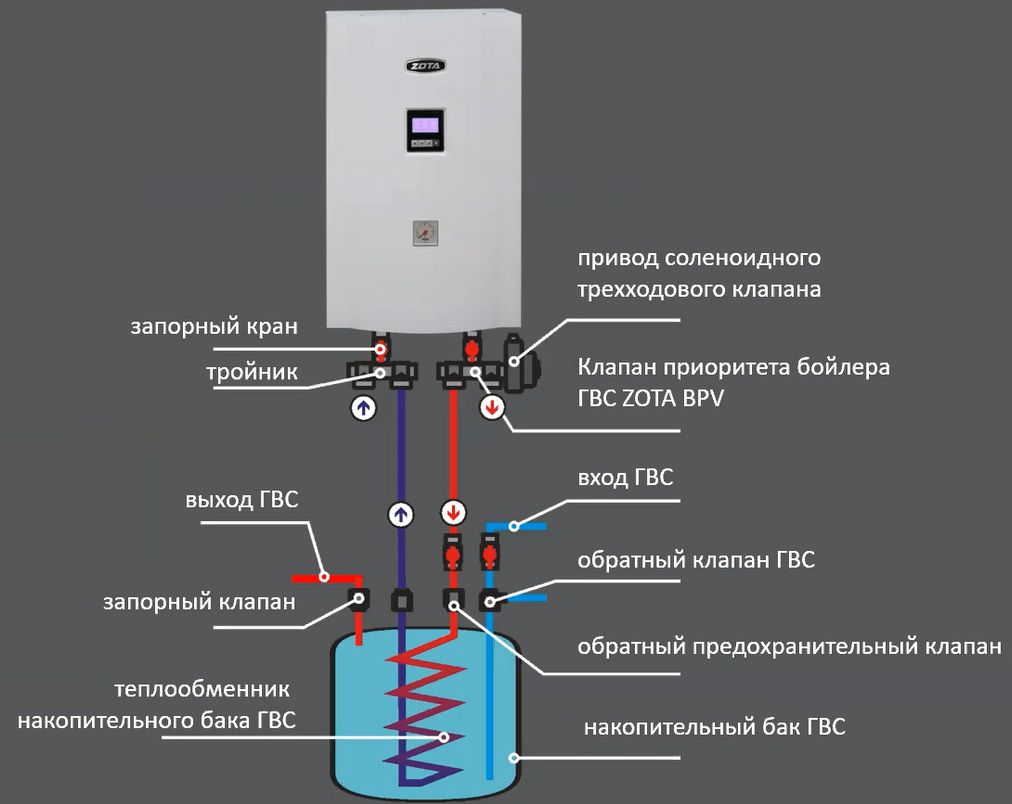 Подключение электрокотла Зота МКС-Плюс мощностью 36 кВт с клапаном приоритета бойлера: