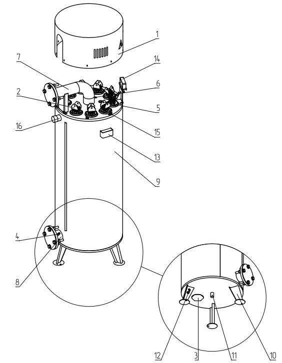 ![]() | 1 - Крышка кожуха 2 - Блок нагревательных элементов 3 - Заглушка резьбовая G2 1/2" 4 - Отверстие для датчика обратного теплоносителя 5 - Отверстие для датчика прямого теплоносителя 6 - Отверстие для датчика перегрева 7 - Выходной патрубок 8 - Входной патрубок 9 - Корпус котла 10 - Опора котла 11 - Сливной патрубок 12 - Болт заземления 13 - Транспортировочный кронштейн 14 - Скоба для крепления кабеля 15 - Пластина для крепления крышки 16 - Патрубок для предохранительного клапана |