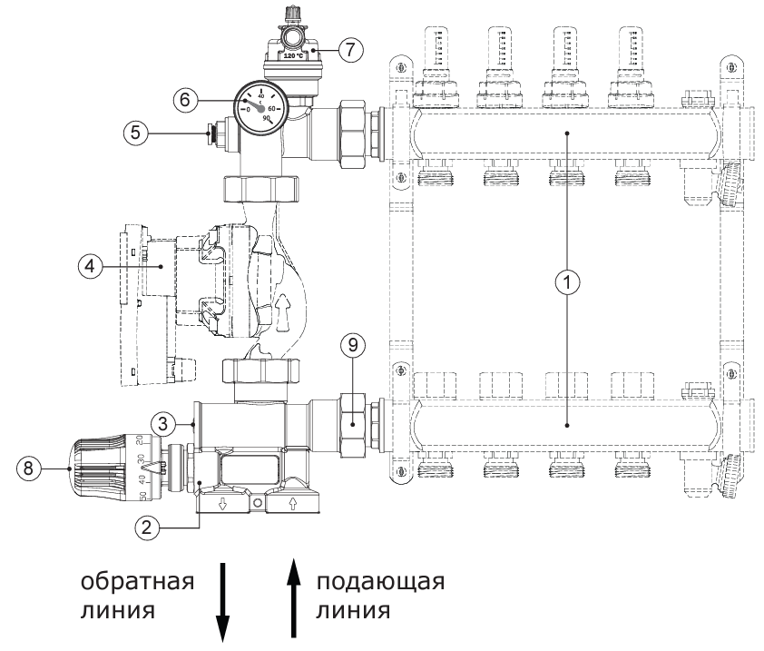 Регулирование температуры происходит путем подмеса жидкости из обратной линии. Регулирование происходит с помощью 2-ходового клапана, установленного в подающем коллекторе и управляемым термостатической головкой с выносным погружным датчиком, который размещен на выходе смесительного узла.