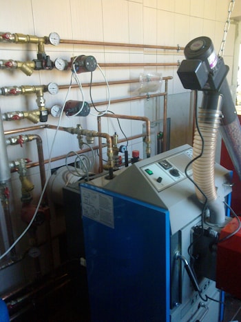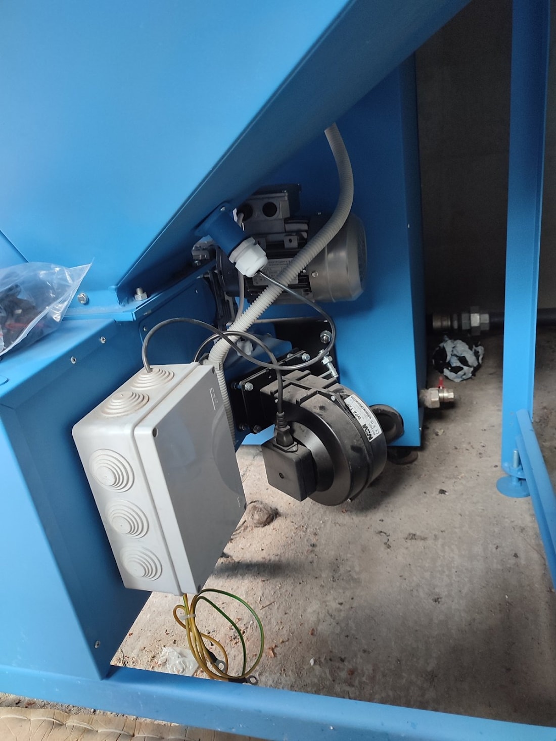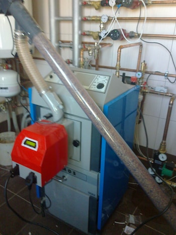 По окончанию отделочных работ была установлена горелка на пеллетах Аtmos А25 со шнековым транспортером и бункером для пеллет объемом 1000л. В итоге, покупатель использует несколько видов топлива - дрова и пеллеты. Обвязка котла, по желанию заказчика, выполнена медью. Установленное оборудование достаточно компактное, не требующее ежедневного присутствия и обслуживания.