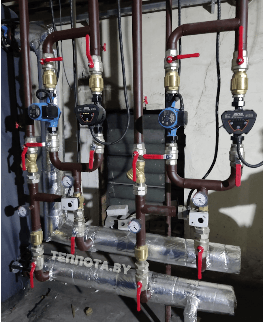 - Для контуров системы отопления и на загрузку бойлера использованы насосные группы