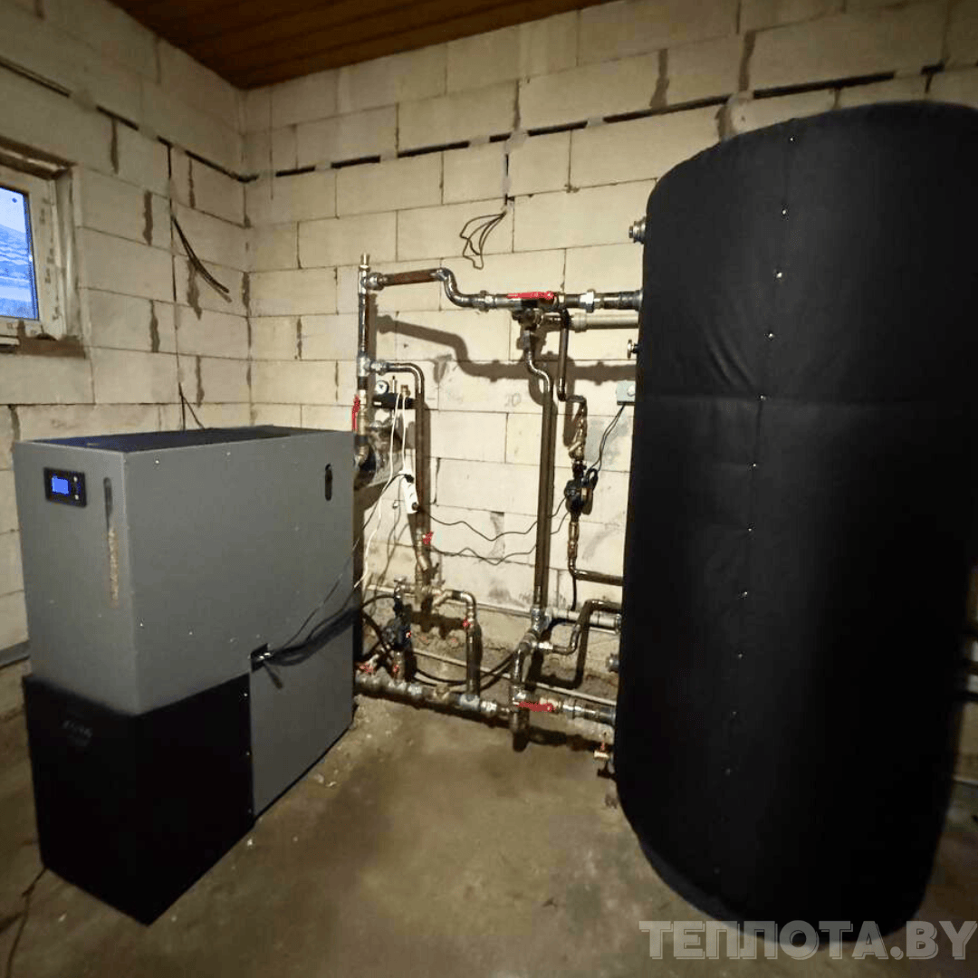 Монтаж системы отопления с пеллетным котлом ZOTA Pony 25 кВт с обвязкой буферной емкости объемом 1000 литров.