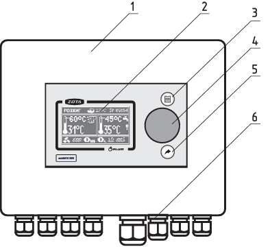 ![]() | 1 - Корпус пульта управления 2 - Экран пульта управления 3 - Кнопка Ввод/Меню (Enter/Menu) 4 - Джойстик пульта управления 5 - Кнопка Отмена/Назад 6 - Сальники для ввода кабелей |