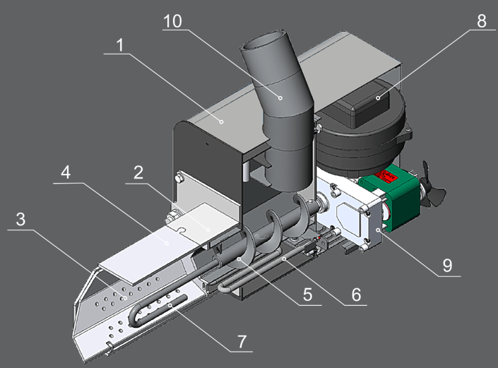 ![]() | 1 - Корпус приставной пеллетной горелки 2 - Корпус топки 3 - Съемная чаша топки 4 - Съемный отбойник топки 5 - Шнек подачи топлива 6 - Нагревательный элемент системы автоподжига 7 - Кочерга автоматической чистки топки 8 - Вентилятор наддува 9 - Мотор-редуктор 10 - Труба приема топлива |