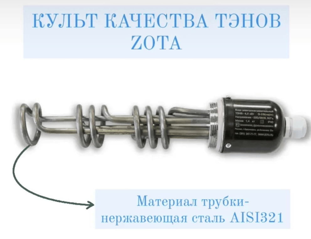 Данная технология производства ТЭНов сложная и дорогостоящая. Соответственно, электрические котлы ZOTA дороже конкурентов, но в масштабе сравнения качества – разница в цене незначительная. А ресурс, надежность, долговечность ТЭНов в котлах ZOTA в разы превышает конкурентов.