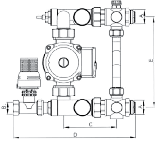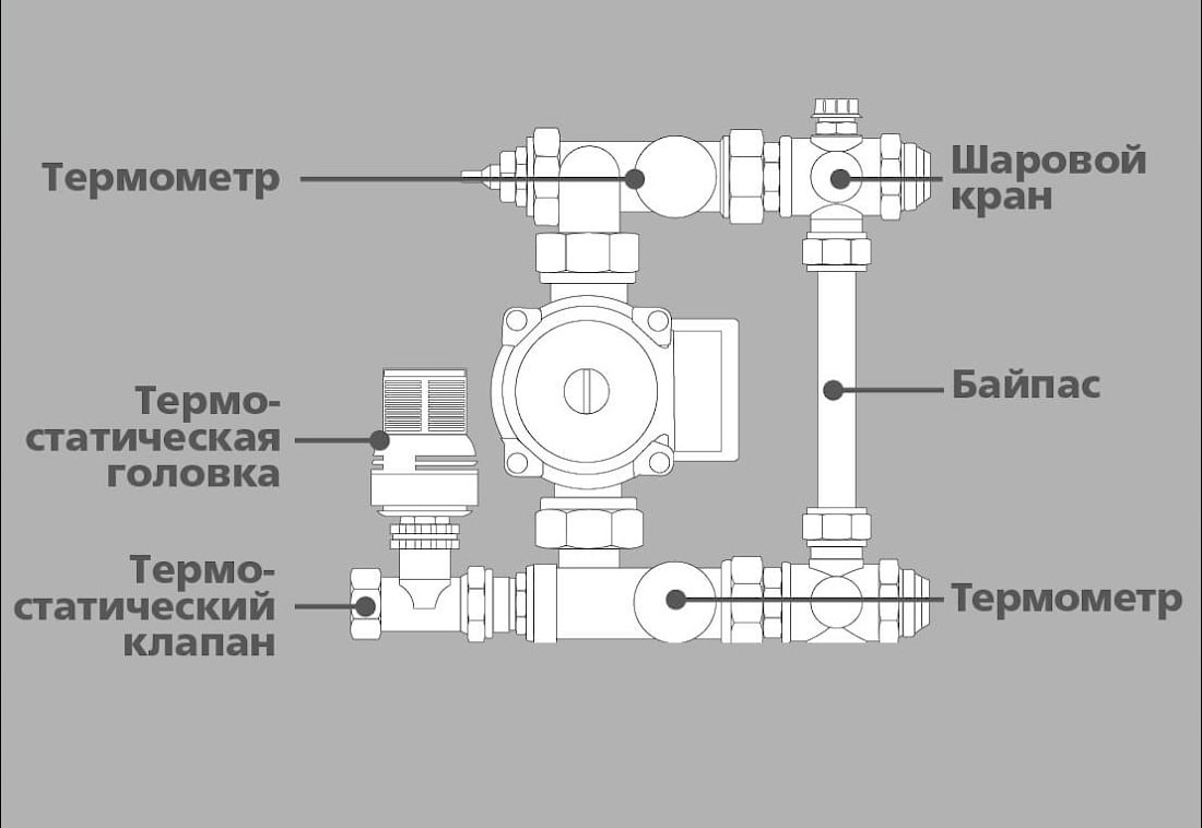 Смеситель состоит из термостатического клапана, используемого в сочетании с балансировочным клапаном. Балансировочный клапан с помощью запорно-регулирующего элемента регулирует количество воды, возвращающейся из обратного контура, направляемое для подмешивания с водой, поступающей в подающий коллектор вторичного контура (теплый пол). Обратный клапан предотвращает попадание горячего теплоносителя, поступающего из котла в обратный коллектор.