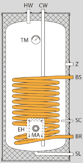 Бак из нержавеющей стали AISI 304 обладает высокой степенью защиты от коррозии. Спиралевидный теплообменник, выполненный из нержавеющей стали AISI 316L, с большой площадью поверхности обеспечивает быстрый и равномерный нагрев ёмкости.